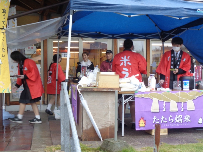 10月30日(金)14:00~16:00、11月1日(土)11:00~14:00に道の駅たたらば壱番地にて、2年生の「うんなんのお米を応援するプロジェクト」の一環で、調査・販売活動を行いました。10月3日(金)14:00~16:00には同地でプレ販売を経験していたため、その反省等が生かされました。