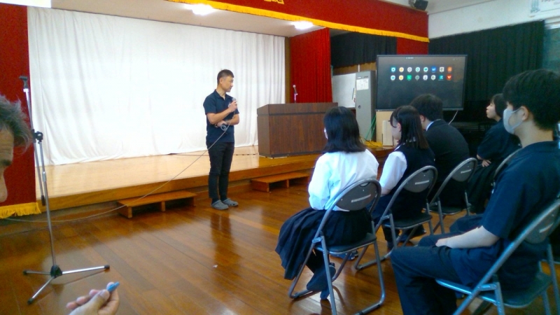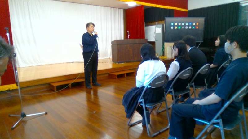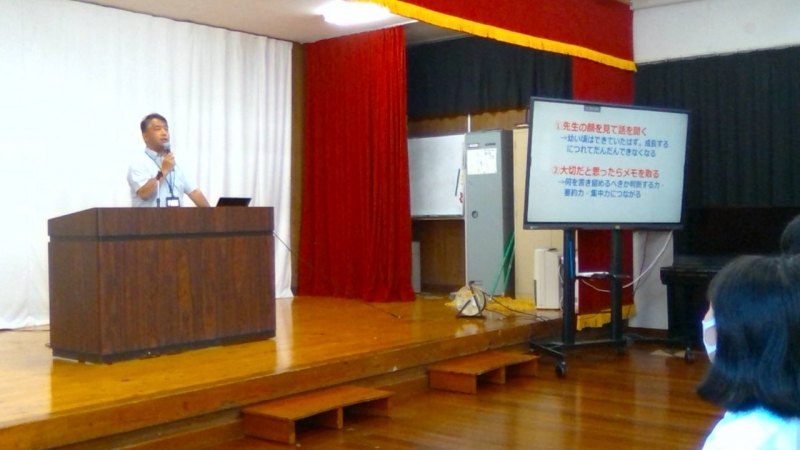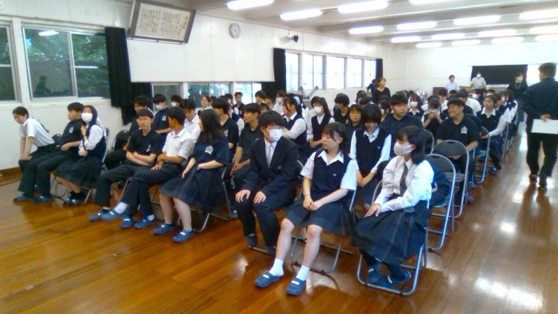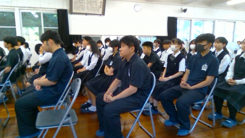 生徒指導主事は1学期の学校生活を振り返り、「自分と全く違う人が周りにいることを自覚してほしい」「自分で自分をコントロールしてもらいたい、そして社会へとマッチしてもらいたい」「長い夏休みに何か一つチャレンジしてほしい、だめならやめて次のチャレンジへと、自分を知る機会となる」と訴えました。