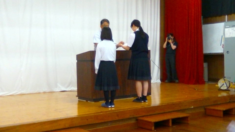 まず、英語検定準2級を取得した生徒2人の健闘を称え、表彰式がありました。