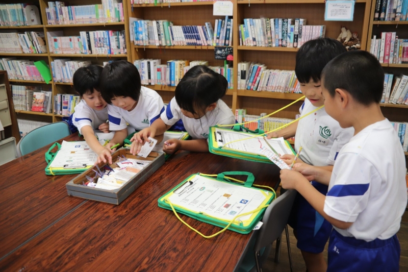 音楽室でのはじめの会でかけこうクイズに挑戦したあと、その答え探しに講堂やコイの池、1年生教室、玄関前、3年生教室、DXラボ、図書館など校舎内を探検しました。
