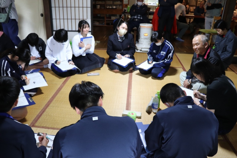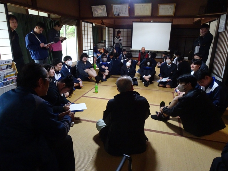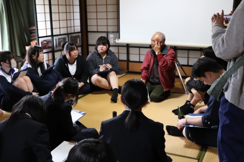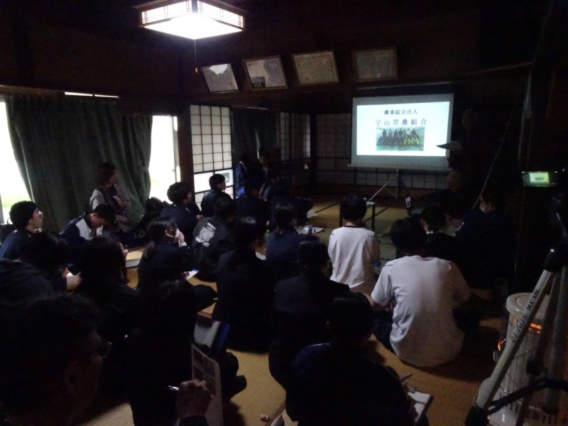 食後は、まず宇山営農組合の方々から、組合の現状や課題、お米ができるまでの流れ、なぜ米を輸出するのか、なぜ台湾なのか(2年生は11月に台湾研修旅行を実施する予定です)、そして台湾でのコメの販売の様子等の説明を受け、宇山地区を空撮した見事な田園風景を映した動画を見ました。そして、雲南市職員の方から雲南市と台湾の交流について、米輸出から人の交流へと題して、現地の物価やレートも交えた具体的な説明がありました。その後、2班に分かれて、営農組合のお二人へインタービューをしました。米作りのやりがい・楽しさや苦労、宇山地区のお米のおいしさなど、次々に質問しました。