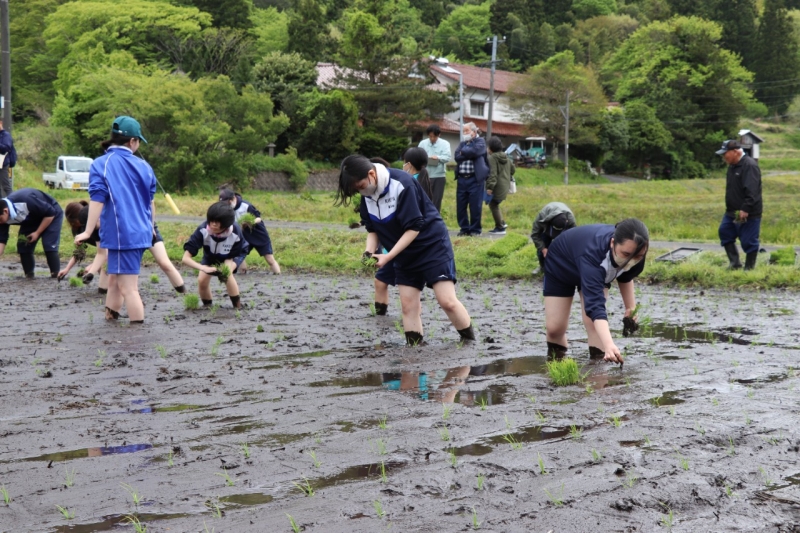 現地到着後さっそく農具「ばばひき」を使ったライン挽きを教えてもらい、その線の上に、全員で苗を植えていきました。この2年生は昨年5月の入間花田植えに参加したこともあり、皆が一度は田植えを経験しています。寒空の下、風も田んぼの水も冷たいなか寒さに震えながらも、時おり空からは柔らかな明るさがのぞき、生徒たちの賑やかな声が広がりました。わずか1時間ほどの田植えでしたが、農家の方々の大変さを実感できました。「楽しくて時間があっという間だった」「またやってみたい」とみんなで協力して田植えができたことに達成感を抱く生徒も多かったです。