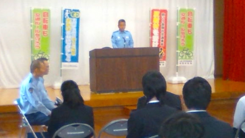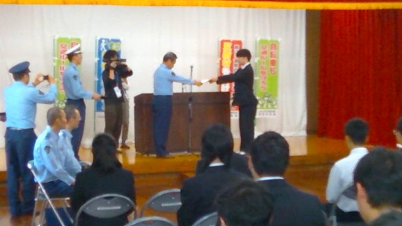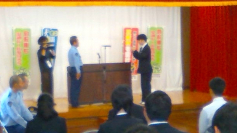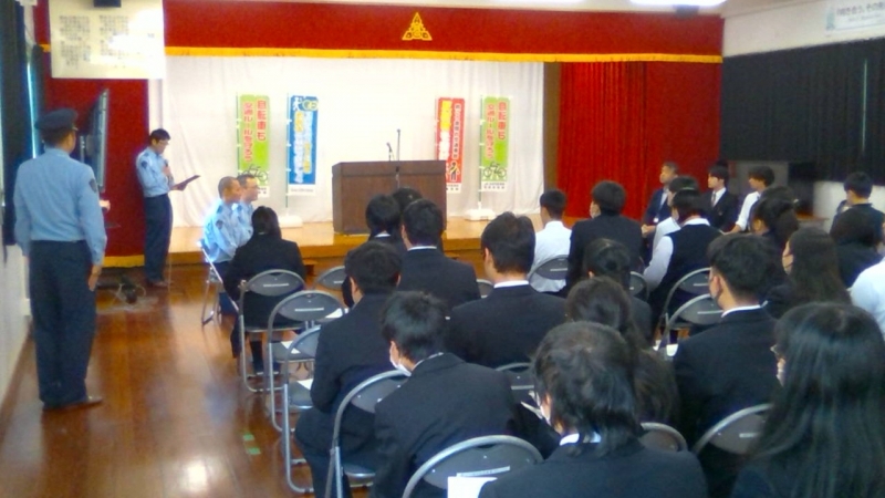 式では、雲南警察署長から新生徒会長へその指定書が交付され、生徒全員へ反射キーホルダーとワイヤーロックを贈呈されました。生徒を代表して生徒会長からは、交通事故に遭わないために、掛合分校の生徒が率先して歩行者、自転車の交通ルールを守り、自転車や家の鍵掛けを行うなど防犯意識を高め、他校の模範となるよう交通マナーアップ・鍵掛け運動を推進すると決意表明がありました。