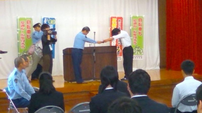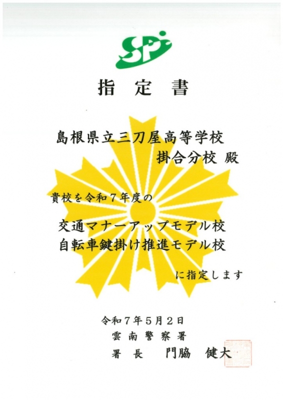 これは「歩行者、自転車の交通ルールの遵守とマナーの向上を目指すとともに、自転車等の盗難被害の減少を図るため、自転車等の鍵掛けを推進する」ことを目的に、管内の学校1校が雲南警察署から毎年指定を受けていますが、今年度は掛合分校がそのモデル校に指定されました。