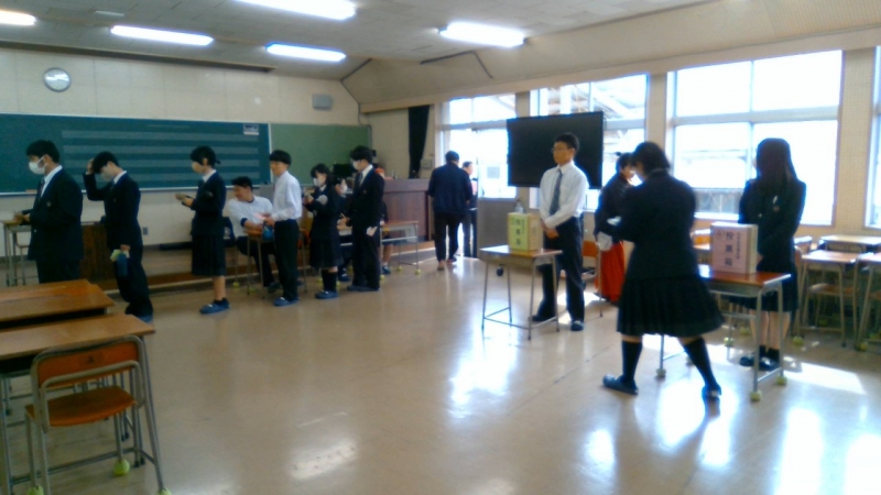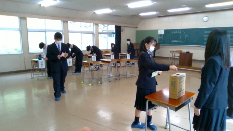 演説会後すぐに投票を行いました。できるだけ本物の選挙のようにという模擬選挙体験も兼ねて、生徒たちは真剣に自分の一票を投じていました。