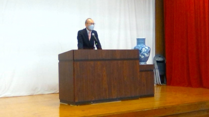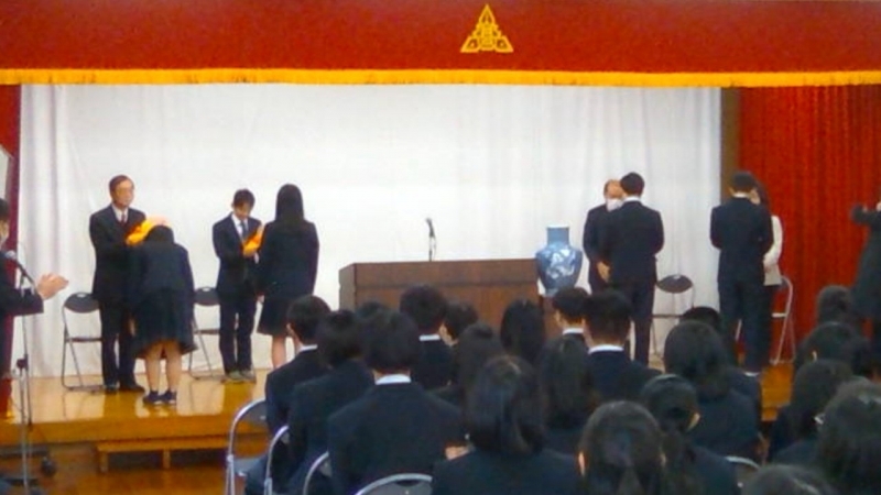 はじめに表彰式では英単語テスト・漢字テスト・掛高基礎力テストの成績上位者、青少年読書感想画県コンクールの入賞者へそれぞれ表彰しました。