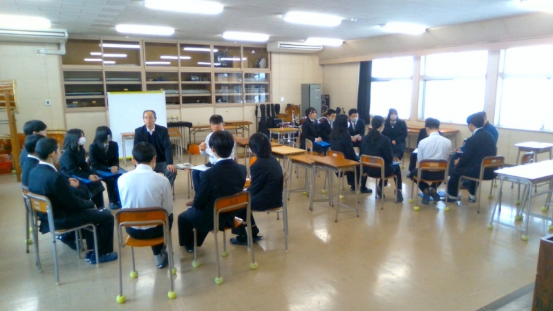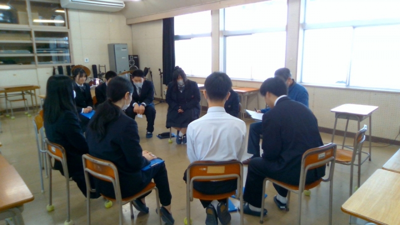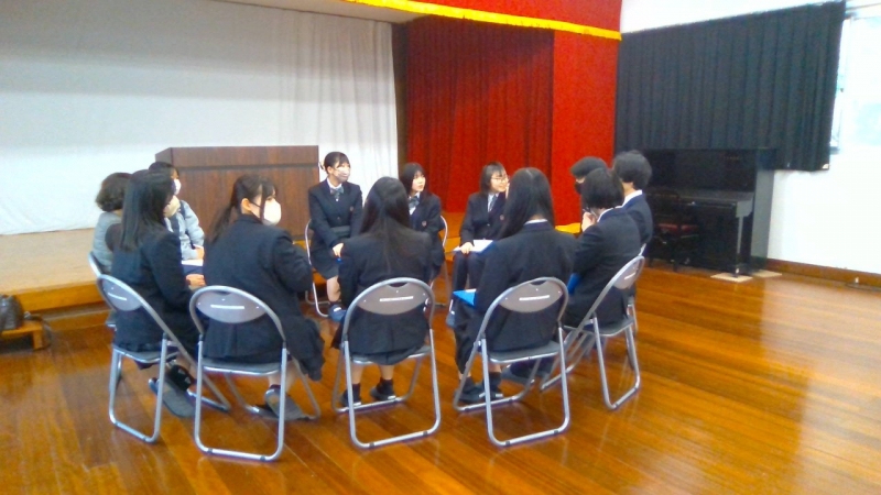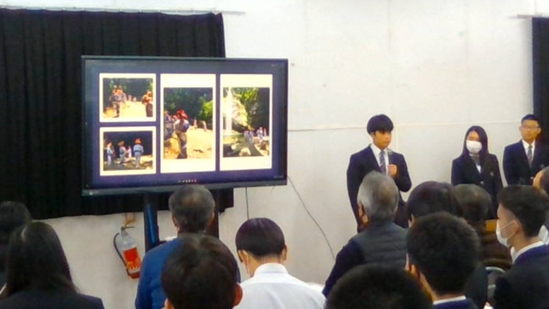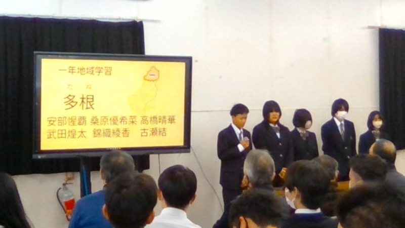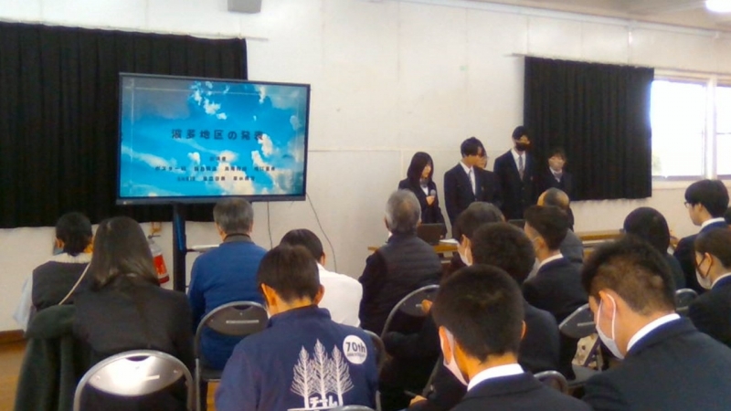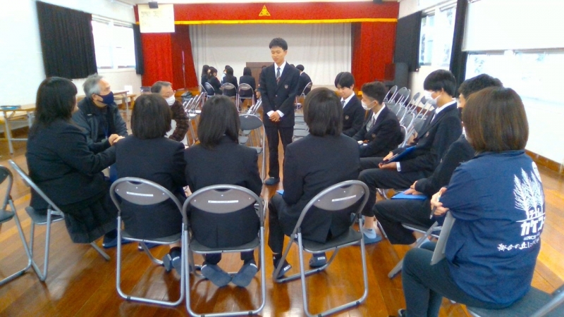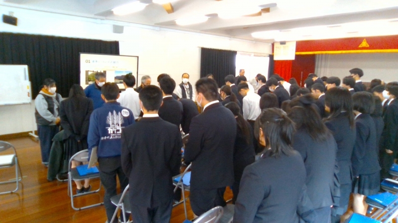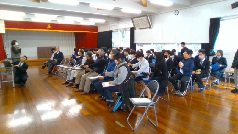 本日はこれまでの取り組みと成果等の最終報告の場であり、各地区の担当の方から直接講評をいただきました。昨年度まではこの時期に各地区に1年生が出向きましたが、今年度は校内開催に変更し、2年生にも聴講してもらい、地区担当の方々には他地区の様子も見ていただく機会となりました。