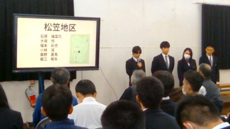昨年4月12日(金)に、入学したばかりの1年生たちは、2年生から昨年度1年間かけて掛合町内5地区に分かれて取り組んだ地域学習の成果と課題について報告を受けました。そして、1年生はこの日からその先輩たちの取り組みと思いを引き継ぎ、今年度の自分たちの探究活動を始めました。