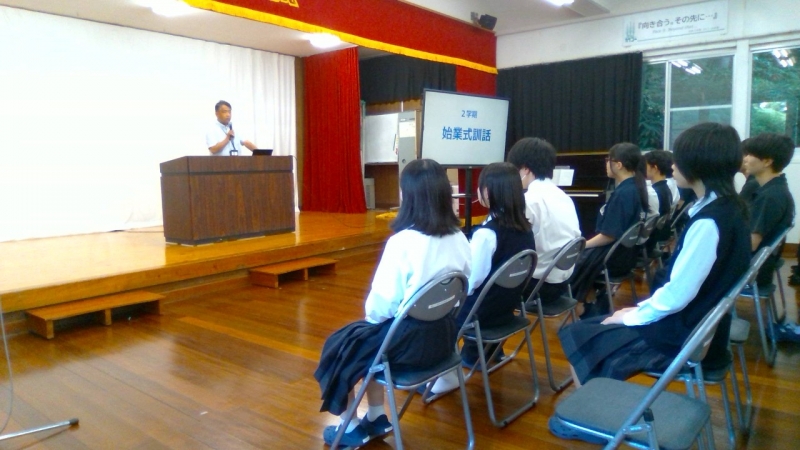 始業式では、校長先生から、この夏のスポーツ観戦(インターハイ・甲子園等)から「流れ」についてお話がありました。「流れ」とは、ある一つのプレーの影響を受けて、その後の試合展開が変わっていく状況であり、たくさんの研究論文が存在しているそうです。