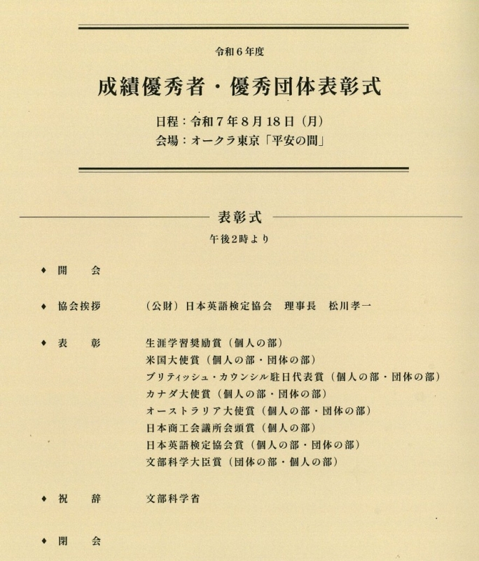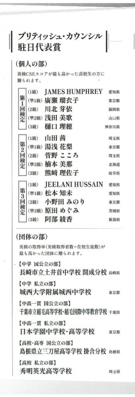 ブリティッシュ・カウンシルは、文化芸術、教育、英語を通じて、イギリスとその他の国の人々の間につながりをつくり、理解と信頼を育みながら、平和と繁栄を築くための支援を行っているイギリスの公的な国際文化交流機関ですが、この賞は英検の取得率(英検取得者数÷在校生徒数)が最も高かった団体、つまり全国一の学校に贈られるものです。