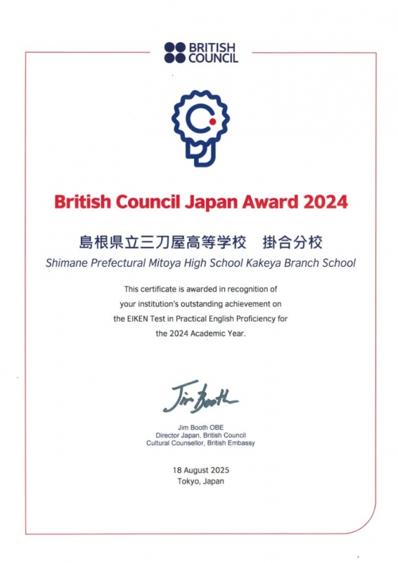 これは8月18日(月)に東京で行われたものですが、掛合分校は「ブリティッシュ・カウンシル駐日代表賞 団体の部【高校・高専 国公立の部】」で表彰されました。