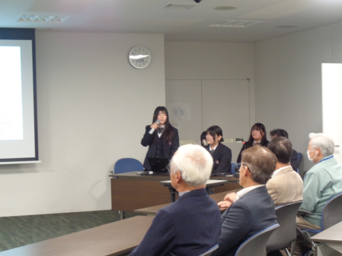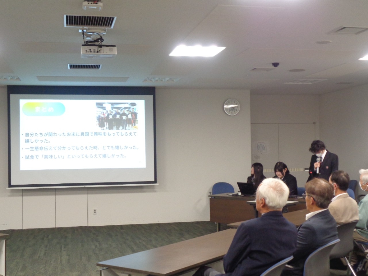 18名の委員の皆さまを前に、この1年間に取り組んだプロジェクト(田植え・稲刈り・米販売)についてスライドを交えて、およそ30分間発表しました。