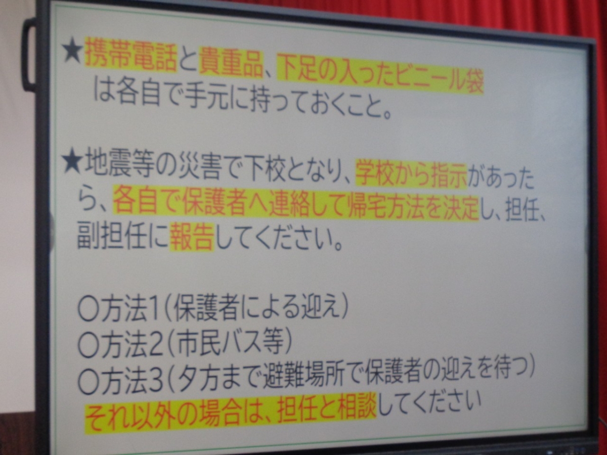 まず、地震発生時の対応について、学校安全教育担当から講話がありました。