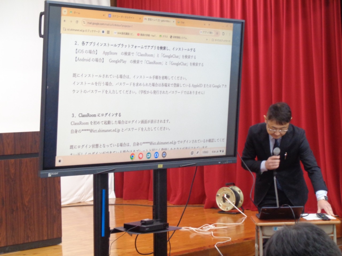 普段の授業から一人1台端末(Chromebook)を利用していますが、身近によく使うスマートフォンはそれとは異なる設定や環境下にあります。地震直後の安否確認も含めた学校と生徒の双方向の連絡のやり取りが十分に徹底できなかった反省を受け、また今後に備えて、一斉に個人端末の設定をしました。
