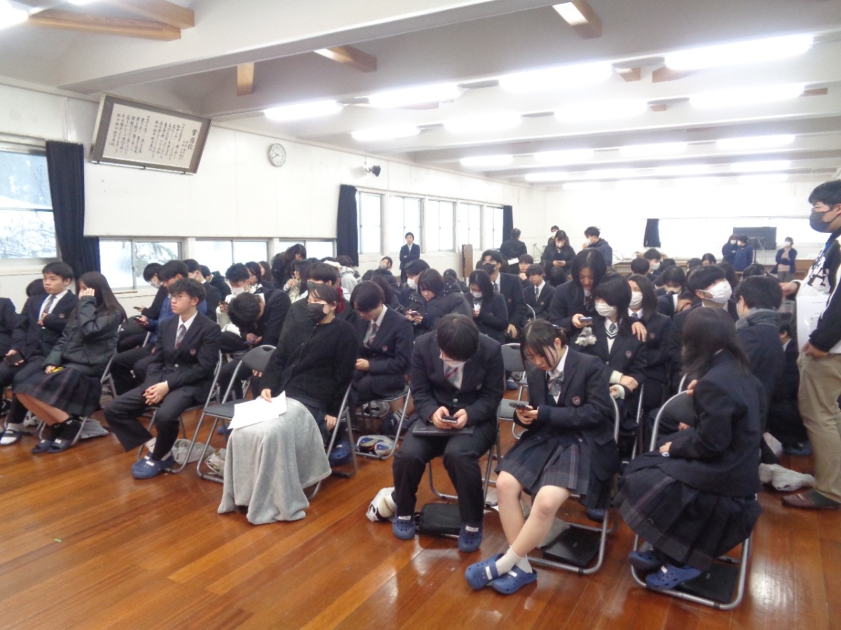 これを受けて、始業式前の日程を急遽変更して、2時間の全校集会を行いました。この前日に、余震に備えて、また非常時の避難を想定して、防寒着、防寒具を着用し、貴重品、スマホ、袋に入れた下足を持参して集合することを予め周知しました。