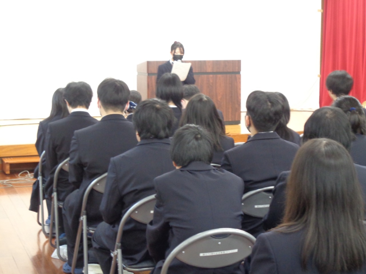 最後に始業式、校長先生からまず「あっという間に終わる3学期にマネジメント(生徒各自の取組に対して)をしっかり」と言葉掛けがありました。そして「友達・仲間」づくりについて、「学校って何?」「社会に出るとどうなる…?」と問いかけがありました。