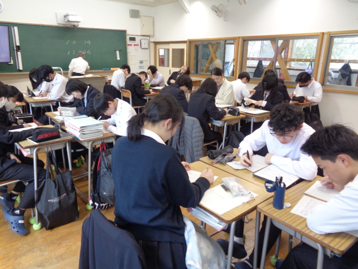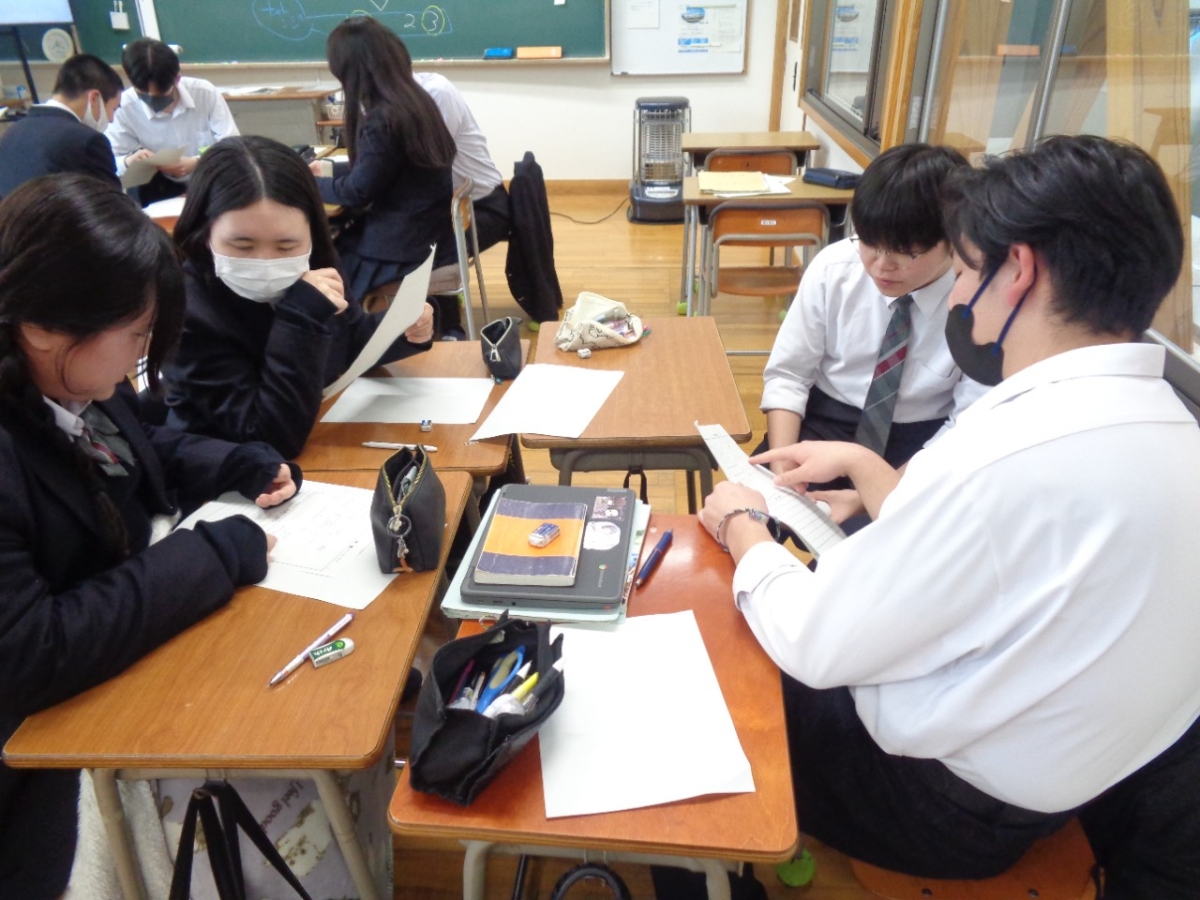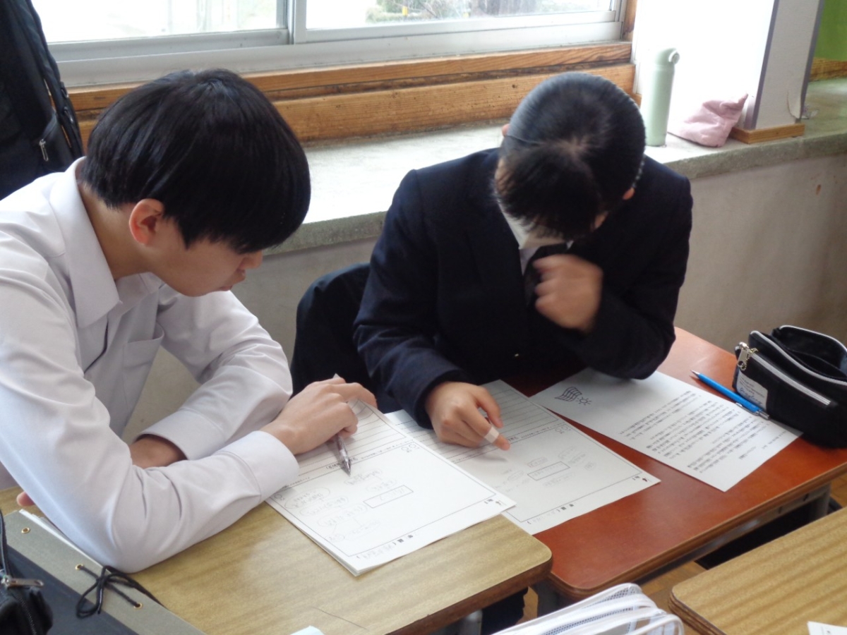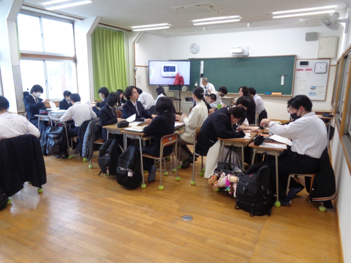 50分間では短かったのですが、概略の説明を交えながら、数分間の個人演習とペア学習をタイマー計測しながら繰り返され、小気味よく工夫された授業展開でした。前回から1年以上経ちましたが、当時に比べ生徒たちは全体的に落ち着いた態度で授業を受けられ、演習にも集中して取り組んでいました。3年生に向かっている証拠だと思います。