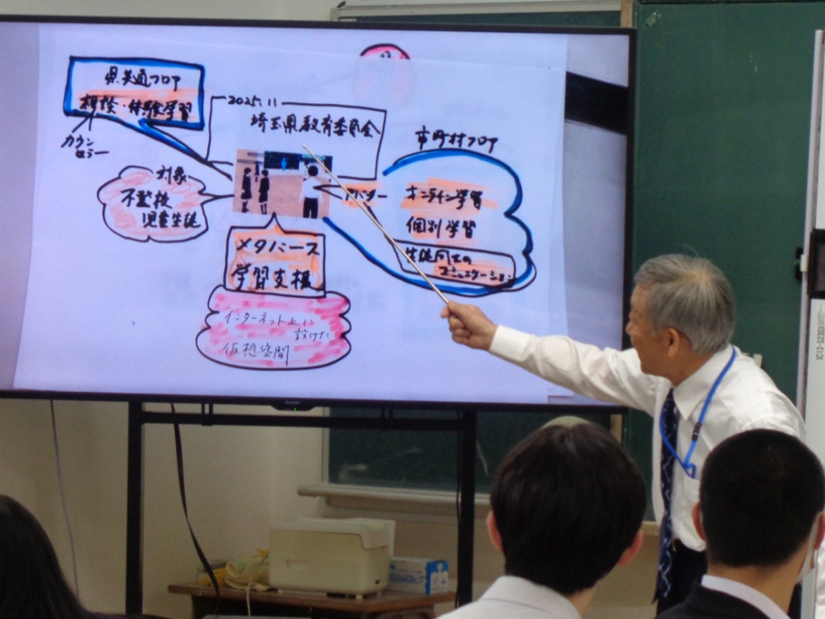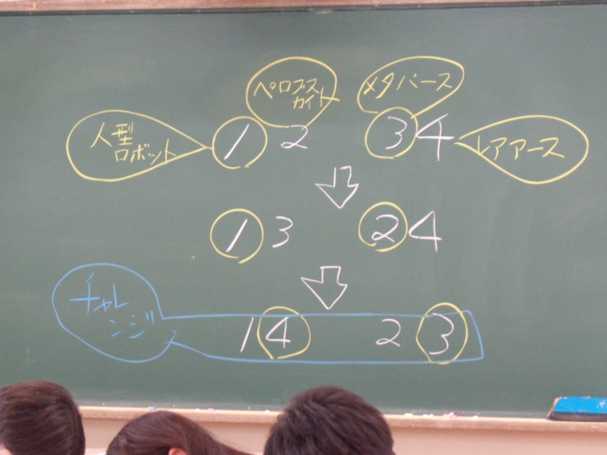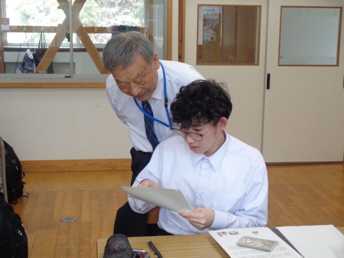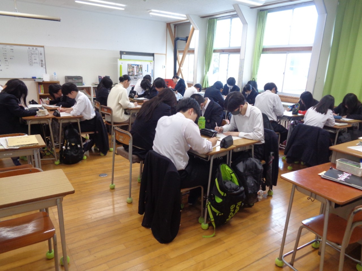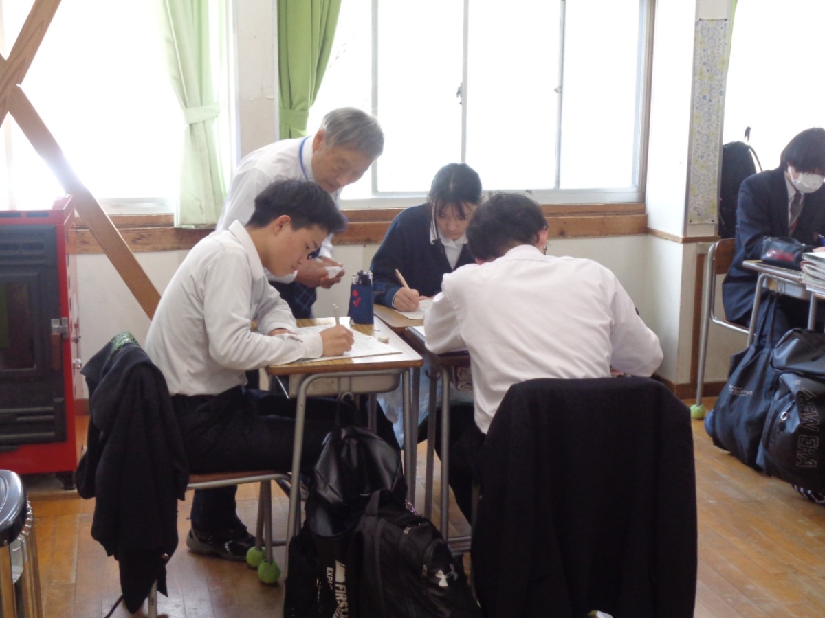 50分間では短かったのですが、概略の説明を交えながら、数分間の個人演習とペア学習をタイマー計測しながら繰り返され、小気味よく工夫された授業展開でした。前回から1年以上経ちましたが、当時に比べ生徒たちは全体的に落ち着いた態度で授業を受けられ、演習にも集中して取り組んでいました。3年生に向かっている証拠だと思います。
